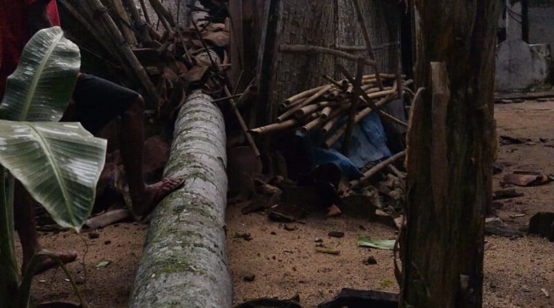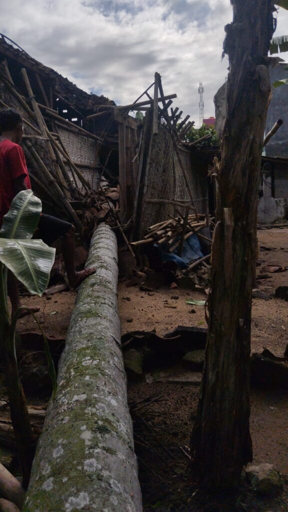 ANGGOTA DAMKAR EVAKUASI POHON TUMBANG YANG MENIMPA RUMAH WARGA DI DESA PURWADADI, TANJUNG BINTANG