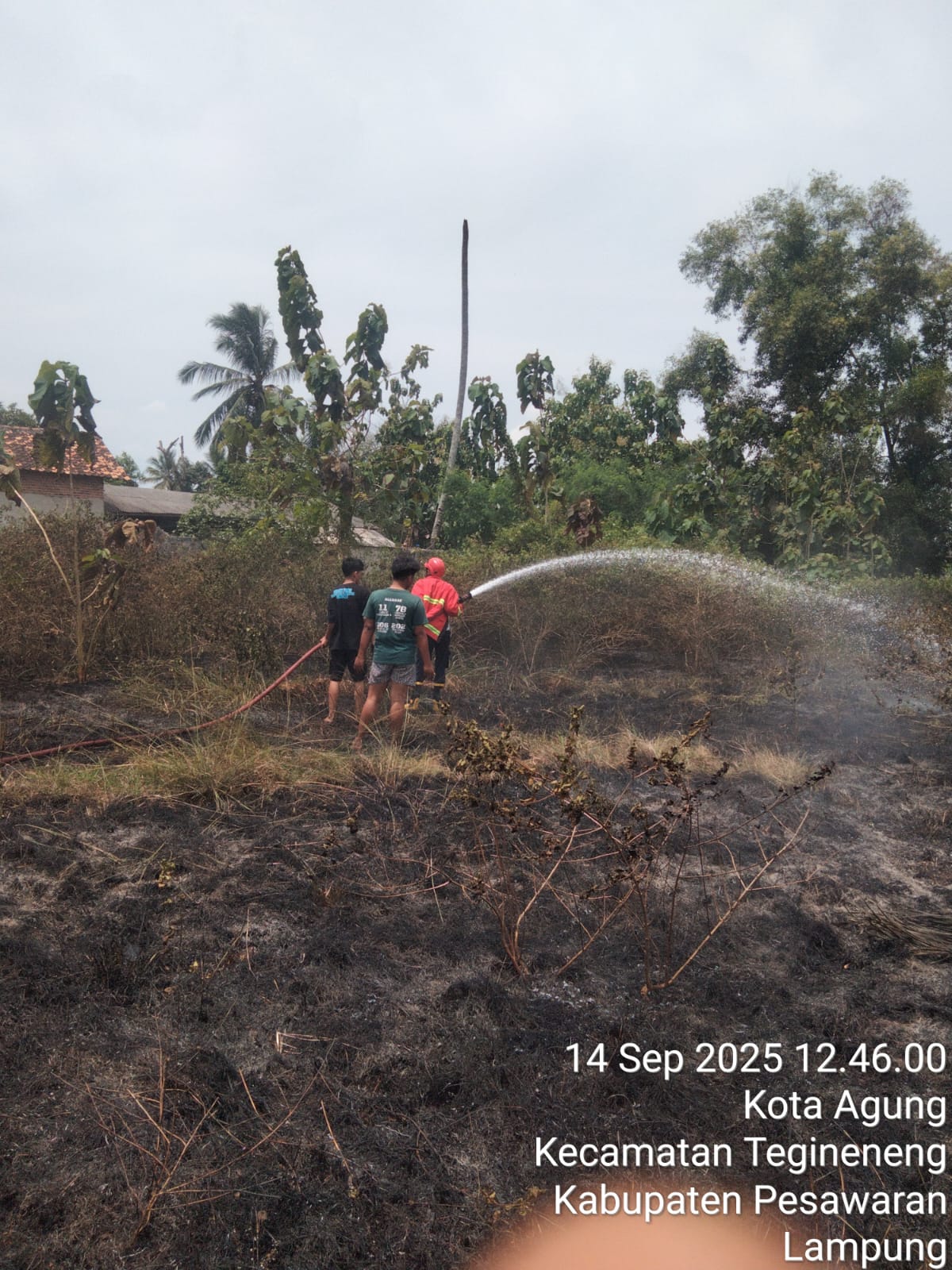 Anggota Dinas Pemadam Kebakaran dan Penyelamatan Kabupaten Lampung Selatan Posko Natar telah melaksanakan pemadaman kebakaran lahan di Desa Kota Agung Kecamatan Tegineneng Kabupaten Pesawaran pada hari Minggu (14-9-2025).
