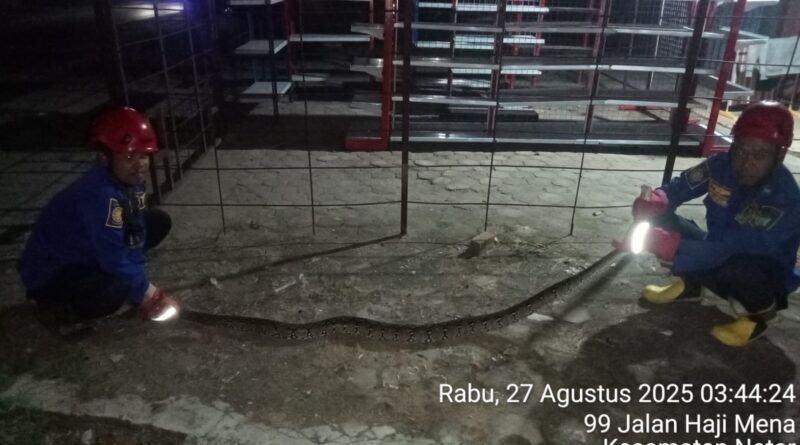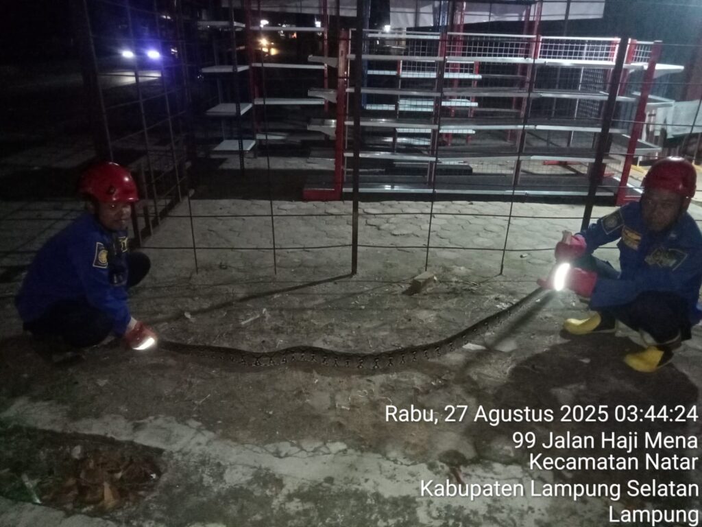 Anggota Dinas Pemadam Kebakaran dan Penyelamatan Kabupaten Lampung Selatan posko Natar telah melaksanakan evakuasi Ular Sanca di Desa Natar Kecamatan Natar Kabupaten Lampung Selatan pada Rabu (27-8-2025).