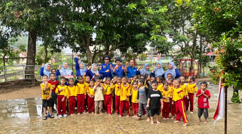 Dinas Pemadam Kebakaran dan Penyelamatan Kabupaten Lampung Selatan posko Tanjung Bintang melaksanakan kegiatan Edukasi dan Sosialisasi sekaligus penyiraman kepada Dewan Guru dan Murid-murid TK Bintang Sakti, Kecamatan Tanjung Bintang, Kabupaten Lampung Selatan, Senin (1-9-2025).