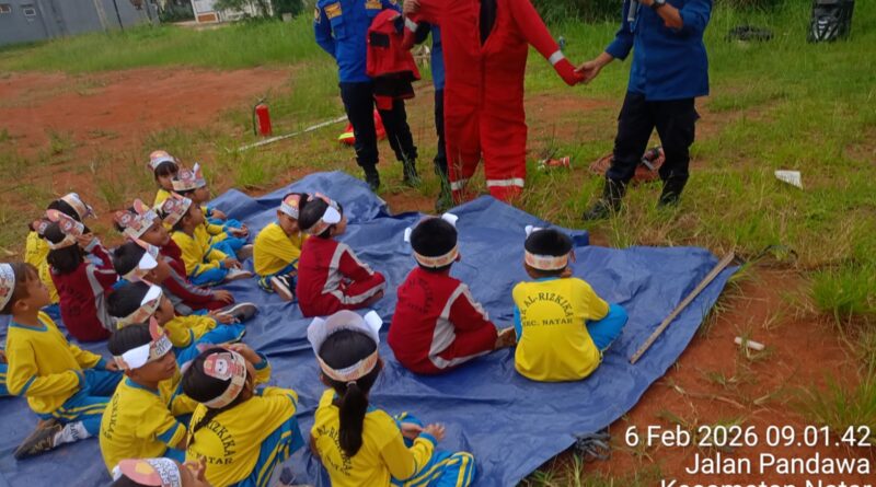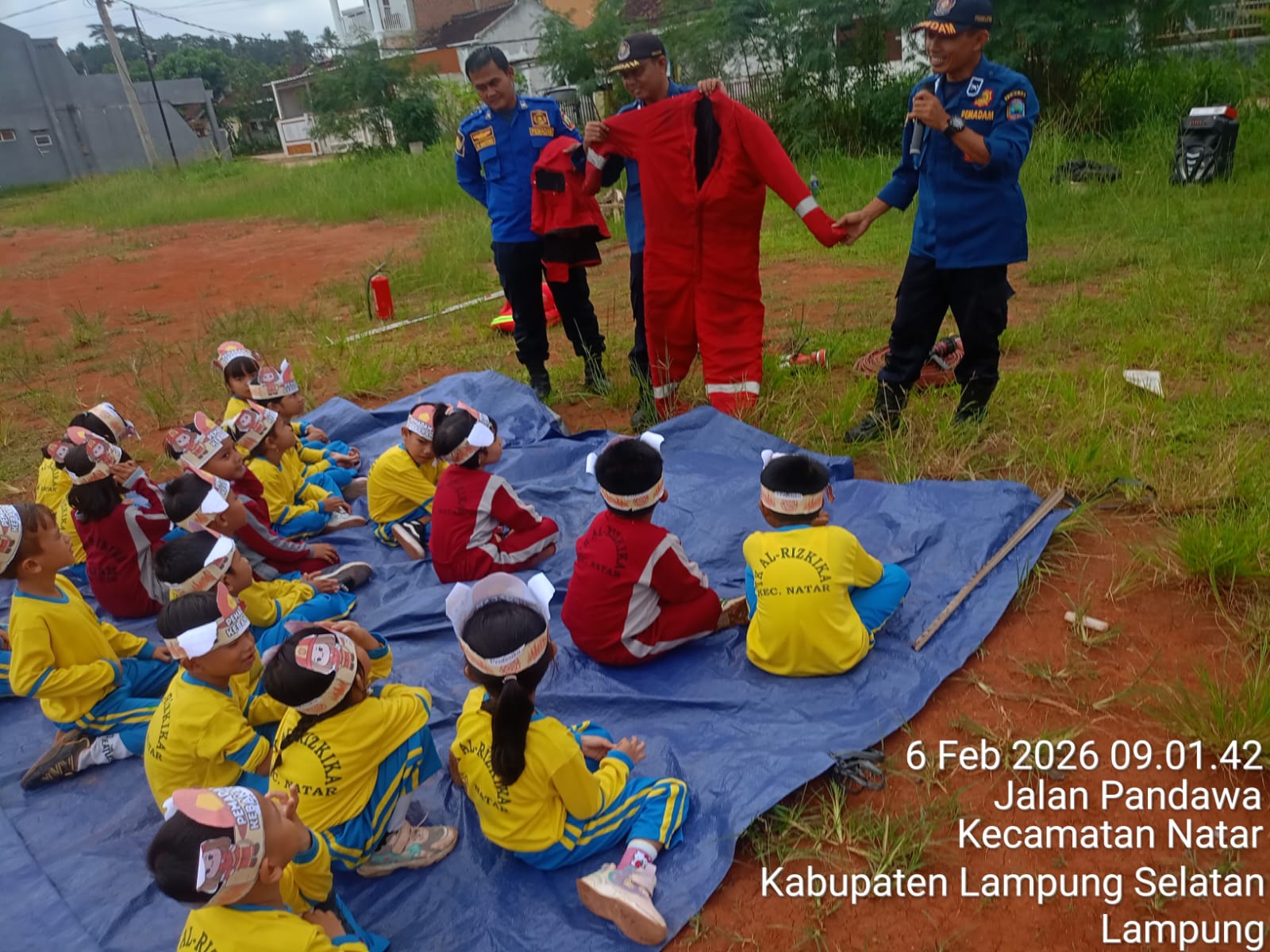 Dinas Pemadam Kebakaran dan Penyelamatan Kabupaten Lampung Selatan posko Natar melaksanakan kegiatan Pengenalan Peralatan Pemadam Kebakaran dan mandi bersama kepada siswa dan siswi TK al Rizkika yang beralamat di Desa Natar Kecamatan Natar Kabupaten Lampung Selatan, Jum’at (6-2-2026).