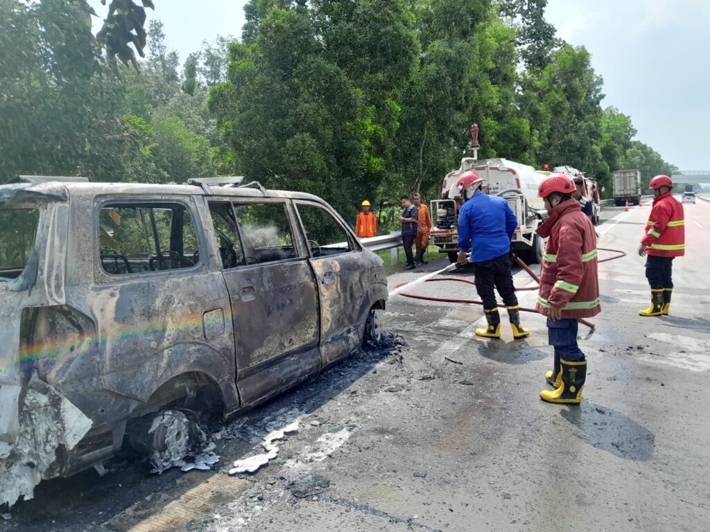 Anggota Dinas Pemadam Kebakaran dan Penyelamatan Kabupaten Lampung Selatan Posko Tanjung Bintang telah memadamkan kebakaran 1 unit mobil minibus Suzuki APV di Ruas Tol Bakter KM 56 pada hari Sabtu (11-10-2025).