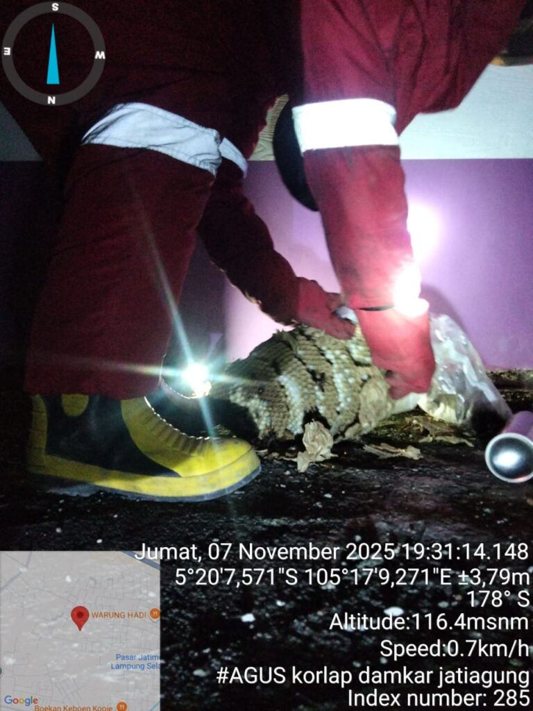 Anggota Dinas Pemadam Kebakaran dan Penyelamatan Kabupaten Lampung Selatan Posko Jati Agung telah selesai melaksanakan evakuasi sarang tawon vespa yang menempel di atap rumah warga Desa Jatu Mulyo Kecamatan Jati Agung Kabupaten Lampung Selatan, Jum’at (7-11-2025).