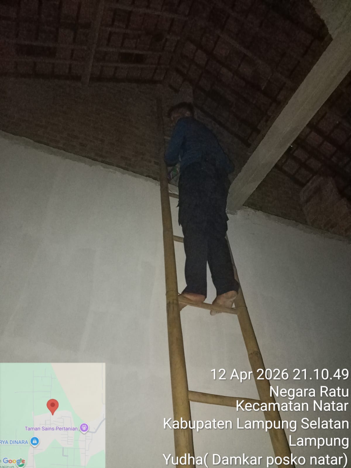 Tim Rescue Dinas Pemadam Kebakaran dan Penyelamatan Kabupaten Lampung Selatan Posko Natar mendapat laporan dari Bapak Eko Irawan sekira pukul 19.30 WIB yang menghubungi Damkar Lampung Selatan posko Natar bahwa ada sarang tawon Vespa yang menempel di atap rumah Bapak Agung yang berlokasi di Dusun Dwi Warna Desa Negara Ratu Kecamatan Natar Kabupaten Lampung Selatan yang keberadaannya membahayakan penghuni dan masyarakat sekitar.