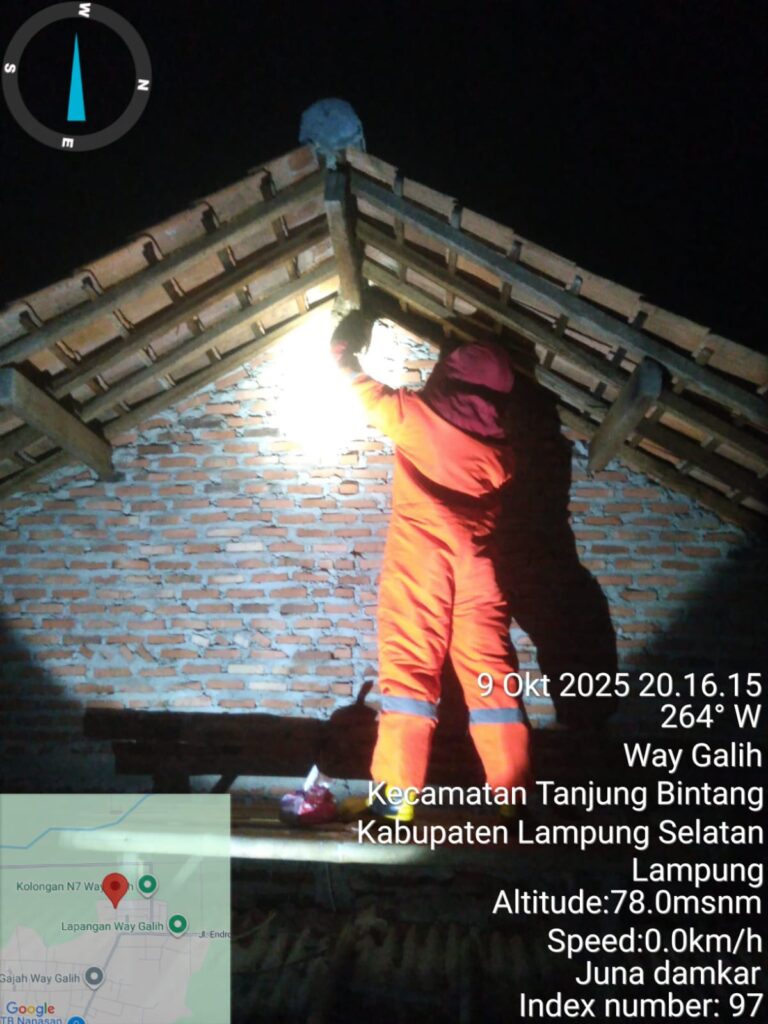 Anggota Dinas Pemadam Kebakaran dan Penyelamatan Kabupaten Lampung Selatan posko Tanjung Bintang telah selesai melaksanakan evakuasi sarang tawon vespa yang menempel di atap rumah warga Desa Way Galih Kecamatan Tanjung Bintang Kabupaten Lampung Selatan, Kamis (09-10-2025).