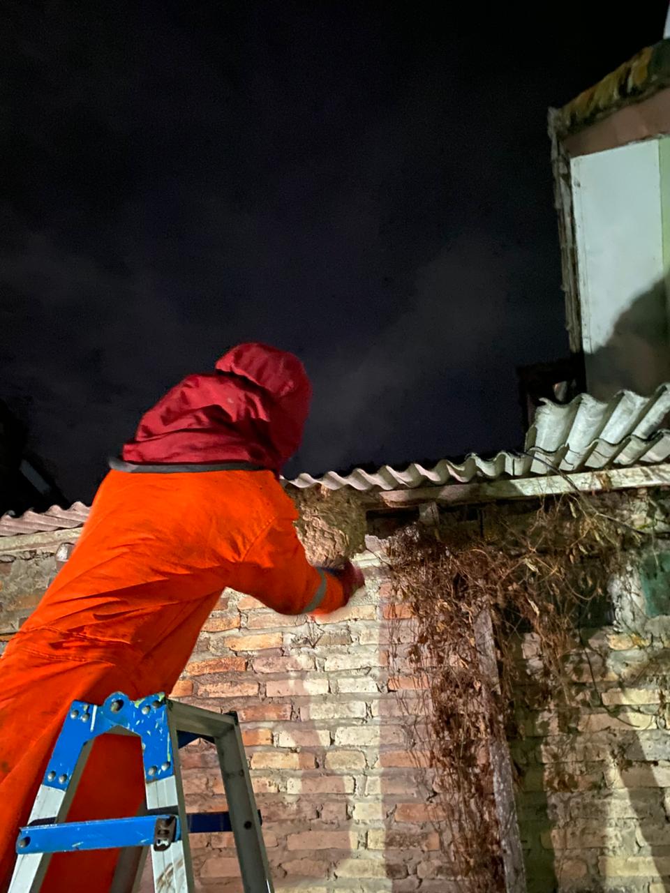Anggota Dinas Pemadam Kebakaran dan Penyelamatan Kabupaten Lampung Selatan Posko Kalianda telah selesai melaksanakan evakuasi sarang tawon Vespa yang menempel di atap rumah warga Kelurahan Way Urang Kecamatan Kalianda Kabupaten Lampung Selatan, Senin (29-12-2025).