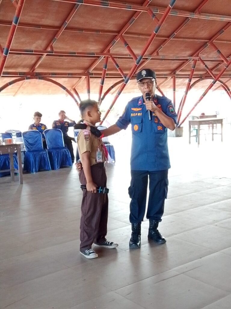 Kepala Dinas Pemadam Kebakaran dan Penyelamatan Kabupaten Lampung Selatan, M. Sefri Masdian, S.Sos memberikan materi tentang pemadam kebakaran dan penyelamatan pada acara Perkemahan Hari Pramuka ke-64 Tingkat Kwartir Ranting Kalianda di Lapangan Agrowisata Way Handak, Kecamatan Kalianda, Minggu (10-8-2025).