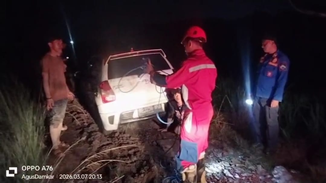 Tim Rescue Dinas Pemadam Kebakaran dan Penyelamatan Lampung Selatan Posko Jati Agung telah membantu mobil minibus yang terperosok di sawah di Kecamatan Jati Agung Kabupaten Lampung Selatan hari Sabtu (7-3-2026).